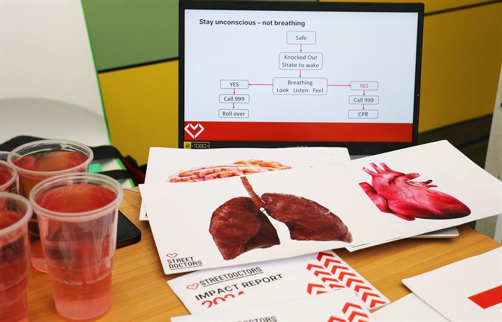 The Street Doctor, Jesse Anim, provided hands-on CPR training using a medical mannequin. Students, including Oscar Suter and Max Meehan, practised critical first-aid techniques designed to help save lives in the event of a stabbing.